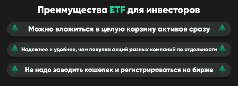 ETF для инвесторов — это возможность вложиться в целую корзину активов сразу. Например, вы можете купить акции в ETF S&P 500 — тогда вы вложите деньги в 500 крупнейших компании Америки. Это надежнее и удобнее, чем покупать акции разных компаний по отдельности. Если какие-то компании из S&P 500 упадут в цене, остальные, скорее всего, вырастут, и инвестор в ETF все равно заработает.