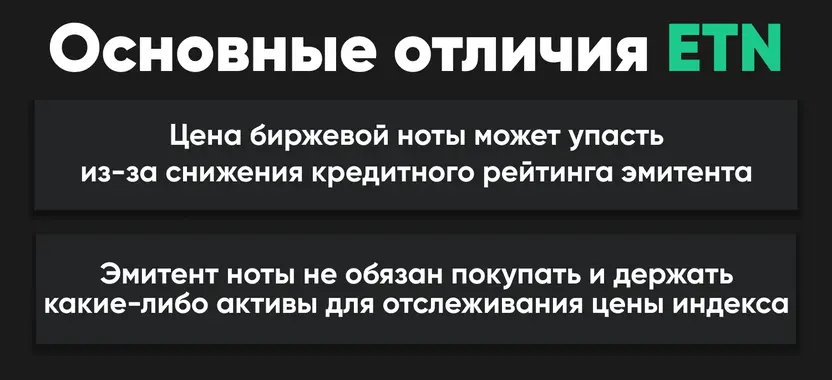 ETN также торгуются на бирже, однако главное их отличие от ETF, по мнению экспертов, в том, что эмитент ноты не обязан покупать и держать какие-либо активы для отслеживания цены индекса. Основной риск при работе с нотами связан с вероятностью дефолта эмитента.