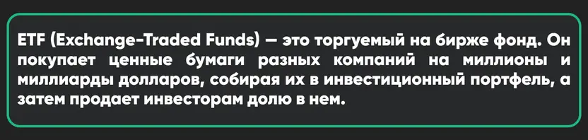 ETF (Exchange-Traded Funds) — это торгуемый на бирже фонд. Он покупает ценные бумаги разных компаний на миллионы и миллиарды долларов, собирая их в инвестиционный портфель, а затем продает инвесторам долю в нем. Одна акция ETF — одна доля портфеля. Акциями ETF можно торговать на бирже как обычными ценными бумагами.