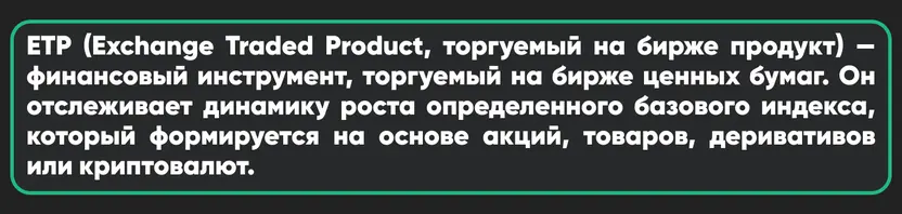 ETP (Exchange Traded Product, торгуемый на бирже продукт) — финансовый инструмент, торгуемый на бирже ценных бумаг. Он отслеживает динамику роста определенного базового индекса, который формируется на основе акций, товаров, деривативов или криптовалют.