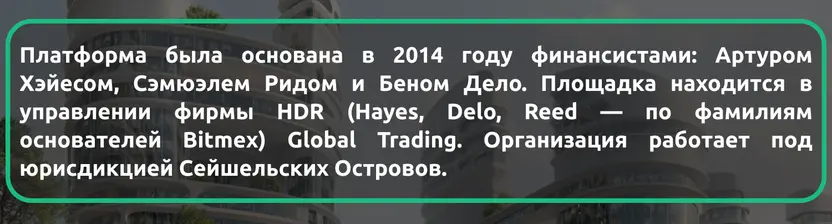 Биржа BitMEX была основана в 2014 году финансистами Артуром Хэйесом, Сэмюэлем Ридом и Беном Дело. Площадка находится под управлением фирмы HDR (Hayes, Delo, Reed — по фамилиям основателей BitMEX) Global Trading. Организация работает под юрисдикцией Сейшельских островов.