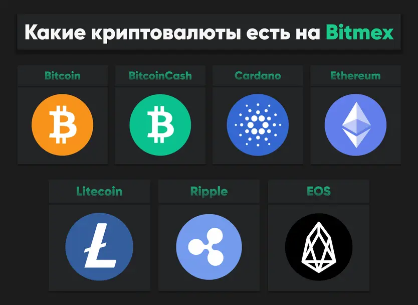 BitMEX дает пользователям возможность торговать фьючерсными контрактами на Bitcoin, BitcoinCash, Cardano, Ethereum, Litecoin, Ripple и EOS. Наиболее ликвидные инструменты — это бессрочный контракт XBT/USD.