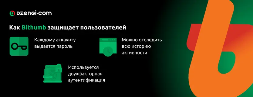 Разработчики платформы постарались сделать торговлю на ней максимально безопасной. В ходе регистрации каждому аккаунту выдается пароль. Кроме того используется двухфакторная аутентификация. На странице личного счета клиента Bithumb можно отследить всю историю всю историю его активности.
