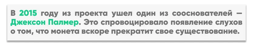 В 2015 году из проекта ушел один из сооснователей — Джексон Палмер. Это спровоцировало появление слухов о том, что монета вскоре прекратит свое существование. Однако Dogecoin удалось удержаться на плаву, не в последнюю очередь благодаря активному пользовательскому сообществу.