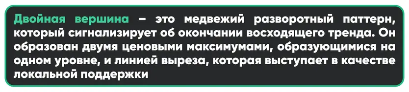 Двойная вершина состоит из двух максимумов, расположенных относительно на одном уровне, и выреза, который в это время представляет собой локальную поддержку.