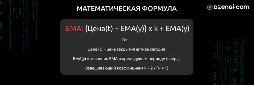 EMA сегодня = ($45,000 × 0.1818) + ($44,500 × 0.8182) = $8,181 + $36,409 = $44,590