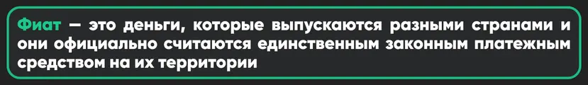 Фиатные деньги — это валюты, которые выпускаются разными странами, и они официально является единственным законным платежным средством на территории этих государства.