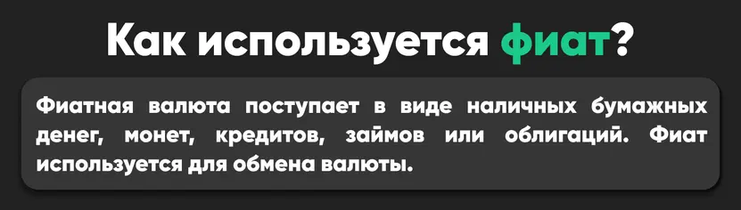 Фиатная валюта поступает в виде наличных бумажных денег, монет, кредитов, займов или облигаций. Фиат используется для обмена валюты. Международные услуги по переводу денежных средств позволяют людям брать одну форму фиксированных денег.