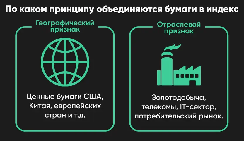 Фондовый индекс – это корзина ценных бумаг, объединенных по какому-либо признаку. Это может быть географический признак – ценные бумаги США, Китая, европейских стран и т.д., отраслевой признак – золотодобыча, телекомы, IT-сектор, потребительский рынок.