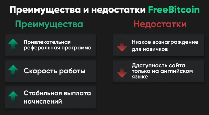 Сервис успешно функционирует уже несколько лет. У него достаточно преимуществ — привлекательная реферальная программа, скорость работы, стабильная выплата начислений и так далее. Однако у FreeBitcoin имеются и недостатки. Среди них можно выделить тот фактор, что на получение существенных выплат новичкам придется потратить много времени. Кроме того, доступность сайта только на английском языке не всегда удобна для глобального пользования платформой.