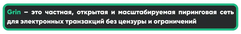 На официальном сайте разработчиков указано, что криптовалюта Grin – это частная, открытая и масштабируемая пиринговая сеть для электронных транзакций без цензуры и ограничений. Технически криптовалюта Грин является реализацией MimbleWimble.