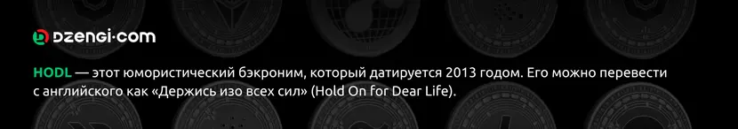 HODL — это юмористический бэкроним, который датируется 2013 годом. Его можно перевести с английского как «Держись изо всех сил» (Hold On for Dear Life).