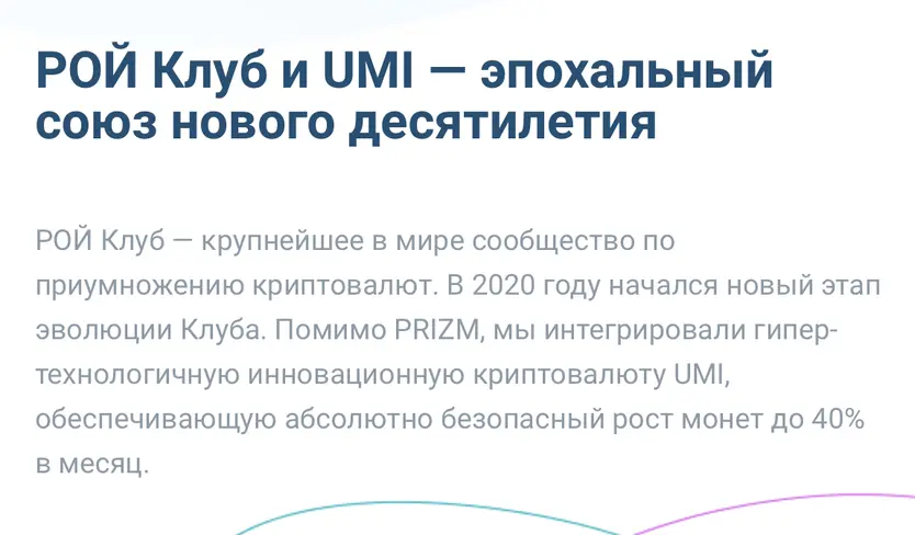 С «РОЙ Клубом» криптовалюта UMI начала работать в июне 2020 года: сами создатели криптовалюты писали об этом на форуме BitcoinTalk и называли клуб первой структурой для стейкинга UMI, а также «самым успешным сообществом для заработка на криптовалюте со 150 000 пользователей» со всего мира. На самом сайте «РОЙ Клуба» утверждается, что это «крупнейшее в мире сообщество по приумножению криптовалют», где можно осуществлять совместный стейкинг UMI и парамайнинг еще одного токена PRIZM.