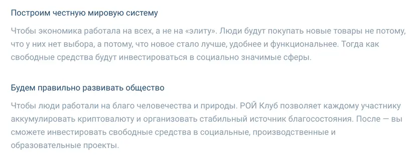 На главной странице «РОЙ Клуб» говорит о своей миссии — улучшить уровень жизни на Земле. Для этого создатели платформы собираются построить «честную мировую экономику», предоставить всем стабильный доход, а полученные средства направить на социальные проекты. На вкладке благотворительного фонда «РОЙ Благо» представлены видеоотчеты тех, кто получил токены PRIZM в качестве помощи от компании. Однако судя по последнему видео, новых отчетов не было с февраля 2020 года.
