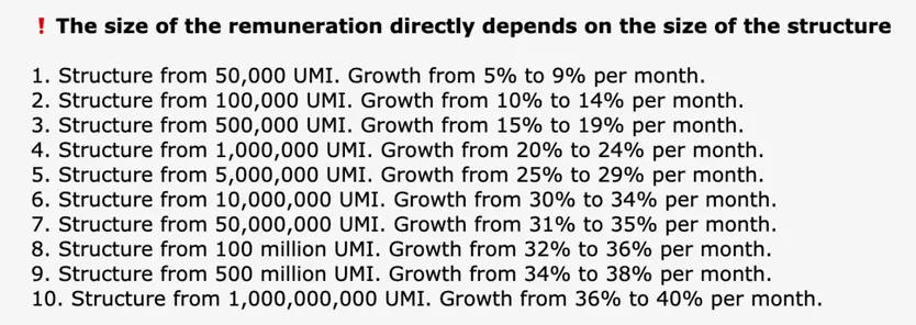 Относительно UMI термин парамайнинг не используется: речь на сайте идет о совместном стейкинге. Этот термин уже использовался в криптовалютной индустрии, однако в другом контексте: речь шла о договоре Coinbase с создателями эфира, который позволил пользователям криптобиржи заниматься стейкингом ETH прямо на Coinbase. Однако, судя по сайту компании и форуму BitcoinTalk, речь здесь идет именно о создании «структуры» пользователей. Именно от размера этой структуры зависит заработок ее пользователей — так, обещанные на сайте 40% за стейкинг может получить группа пользователей с 1 млрд UMI на счету, что по курсу на дату публикации составляет $2,23 млрд.