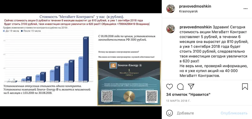 В личном инстаграме Мошкина, который не активен с 2018 года, есть и другие инвестиционные предложения: например, он предлагал пользователям купить «безоплатное электричество» от источника электроэнергии с нулевой себестоимостью и «увеличить свои инвестиции в 620 раз».