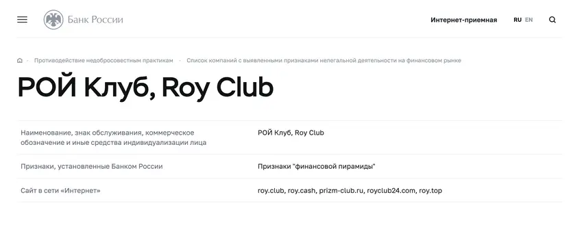 Самый главный факт, который должен насторожить инвесторов — с середины 2021 года «РОЙ Клуб», который распространяет UMI, числится в списке финансовых компаний с выявленными признаками нелегальной деятельности, который регулярно обновляет Центральный банк России. ЦБ предупреждает, что «РОЙ Клуб» демонстрирует признаки финансовой пирамиды.