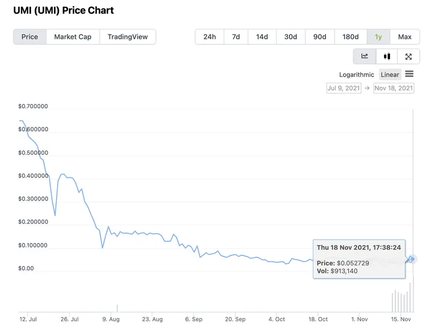 Судя по данным статистики на CoinMarketCap и CoinGecko, цена UMI постоянно падала с июля по ноябрь 2021. Медвежий рынок — не редкость для криптовалют, однако затяжные падения всегда вызывают вопросы.