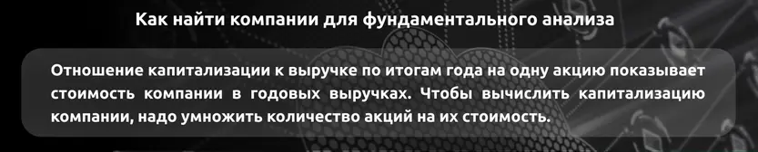 Следующий мультипликатор P/S (отношение капитализации к выручке по итогам года на одну акцию), то есть показывает стоимость компании в годовых выручках. Чтобы вычислить капитализацию компании, надо умножить количество акций на их стоимость.