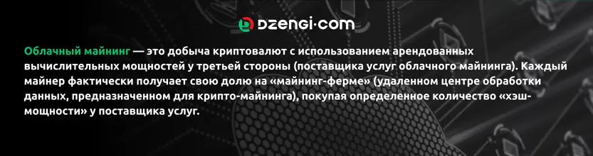 Облачный майнинг — это добыча криптовалют с использованием арендованных вычислительных мощностей у третьей стороны (поставщика услуг облачного майнинга). Каждый майнер фактически получает свою долю на «майнинг-ферме» (удаленном центре обработки данных, предназначенном для криптомайнинга), покупая определенное количество «хэш-мощности» у поставщика услуг. В обмен провайдер предоставляет майнерам доступ к премиальным выплатам, которые пропорциональны количеству приобретенных ими мощностей для хеширования.
