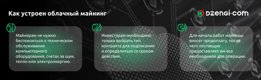 Поскольку майнинг проходит через облачные сервера, майнерам не нужно беспокоиться о техническом обслуживании компьютерного оборудования, счетах за шум, тепло или электроэнергию. Поэтому после того, как найден надежный поставщик услуг облачного майнинга, инвесторам нужно только выбрать тип контракта для подписания и определиться со сроком действия. Для начала работ майнеры вносят предоплату либо в фиатных деньгах, либо в цифровых валютах, после чего поставщик предоставляет им все необходимое для операции.