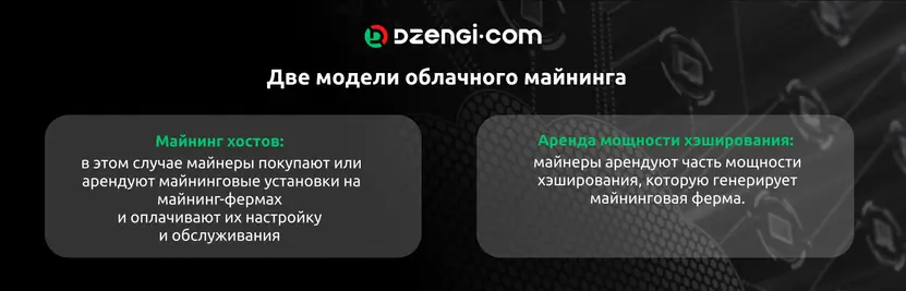 Существует две базовые модели облачного майнинга. Во-первых, майнинг хостов: в этом случае майнеры покупают или арендуют майнинговые установки на майнинг-фермах и оплачивают их настройку и обслуживание. Эта модель снижает затраты, связанные с доступом к электроэнергии. Вместе с тем, майнеры имеют больший контроль над оборудованием для добычи монет, они могут перенаправлять генерируемую мощность хэширования в пулы майнинга. Кроме того, майнеры получают полный контроль над получаемыми премиями.