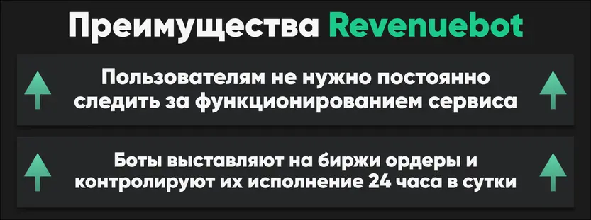 Удобство состоит в том, как говорится на сайте Revenuebot, что пользователям не нужно постоянно следить за функционированием сервиса. Они могут торговать парами на различных площадках, в то время как бот или несколько ботов выставляют на биржи заявки и контролируют их исполнение 24 часа в сутки. При этом боты не предоставляют торговых сигналов: клиент может изучить удачные стратегии, но решение по сделке остается за ним.