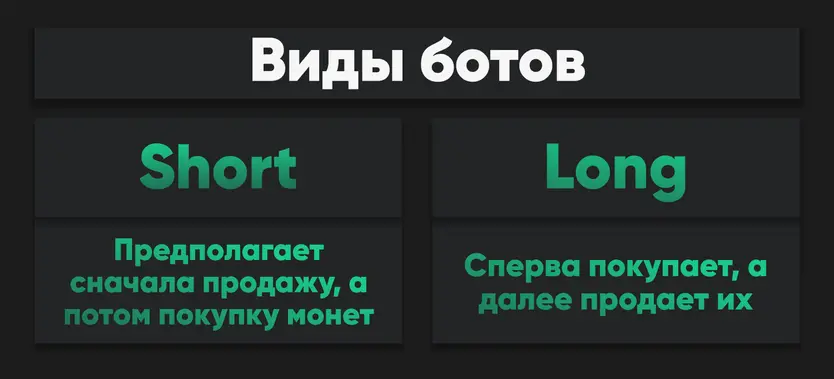 Боты работают согласно двум алгоритмам: Short и Long. Первый предполагает сначала продажу, а потом покупку монет. Второй — сперва покупает, а далее продает их. Бот самостоятельно выставляет фильтры для начала торгов, настраивает автоматический подбор пар и демонстрирует результат за прошедшие 60 дней.