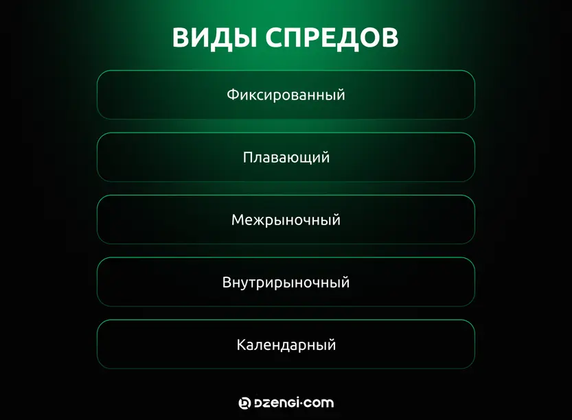 На бирже различают несколько видов спредов: фиксированный, плавающий, межрыночный, внутрирыночный и календарный. Значение фиксированного спреда указано в договоре, заключенном между брокером и трейдером. Таким образом прибыль от сделки известна заранее и не меняется в течение торговой сессии.