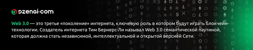 Web 3.0 — это третье «поколение» интернета, ключевую роль в котором будут играть блокчейн-технологии. Создатель интернета Тим Бернерс-Ли называл Web 3.0 семантической паутиной, которая должна стать независимой, интеллектуальной и открытой версией Сети.