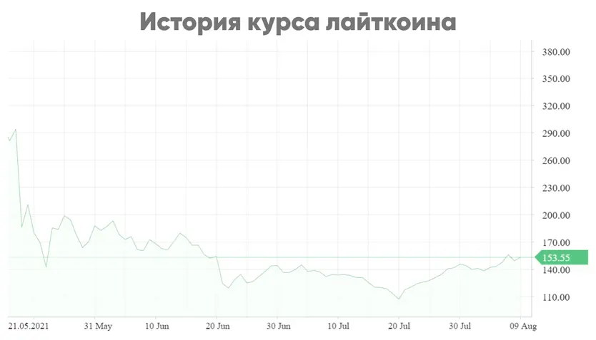 В последние годы внимание инвесторов переключилось на эту «серебряную» альтернативную виртуальную валюту. По состоянию на 7 августа 2021 г. лайткоин занимал место в рейтинге по капитализации (более $10 млрд). Согласно данным coinmarketcap.com, курс на момент написания текст составлял $154,59.