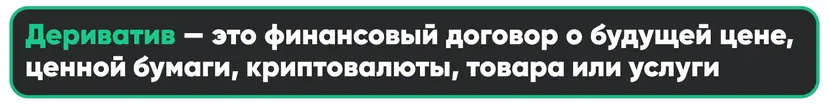 Дериватив — это финансовый договор о будущей цене ценной бумаги, криптовалюты, товара или услуги. Предмет такого договора называется базовым активом. Продавцы и покупатели деривативов не владеют базовыми активами, а продают и покупают право на исполнение договора.