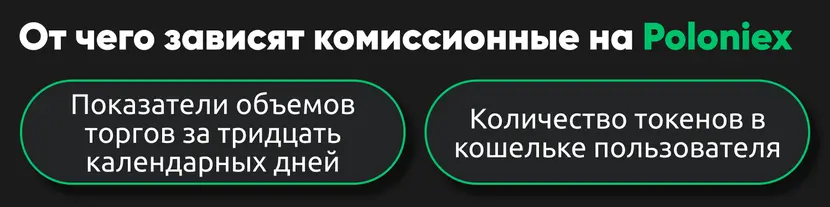 Величина комиссионных на Poloniex складывается из показателей объемов торгов за тридцать календарных дней и количества токенов (в кошельке пользователя. При этом, соблюдается еще одно правило. Отсутствие токенов на счету – гарантия того, что комиссии не уменьшатся, даже, если объем торговых операций клиента биржи резко возрастет.