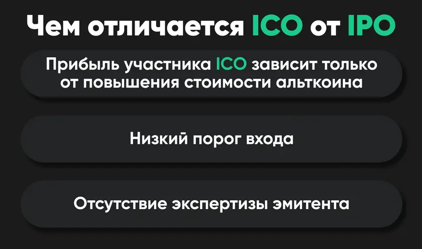 Что такое IPO (Initial Public Offering)? Это публичное размещение акций на бирже. И при покупке этих акций инвесторы получают долю в компании, и прибыль (дивиденды). А наличие токенов ICO ничего не гарантирует. Прибыль зависит только от повышения стоимости нового альткоина на торговых платформах.