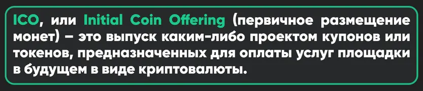 ICO, или Initial Coin Offering (первичное размещение токенов) – это выпуск каким-либо проектом купонов, или токенов, предназначенных для оплаты услуг площадки в будущем в виде криптовалюты. При этом, по словам Дмитрия Солодкого, специалиста по Data Science, в отличие от IPO, покупатели валюты не получают доли в компании и никак не могут воздействовать на внутренние управленческие решения.