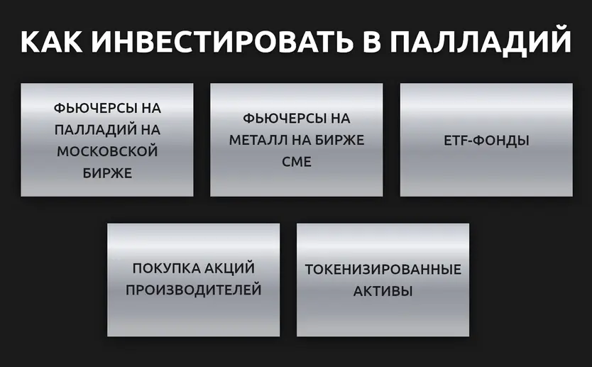 Инвесторы, рассматривающие для себя инвестиции в палладий, могут выбрать несколько подходящих инструментов. Во-первых, можно просто купить фьючерсы на Московской бирже. Фьючерсы бывают разного типа с различными сроками погашения от квартала до года, и подробности каждого контракта опубликованы непосредственно на сайте биржи.