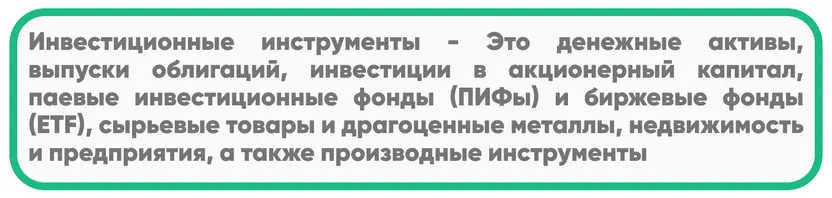 Инвестиционные инструменты — это денежные активы, выпуски облигаций, инвестиции в акционерный капитал, паевые инвестиционные фонды (ПИФы) и биржевые фонды (ETF), сырьевые товары и драгоценные металлы, недвижимость и предприятия, а также производные инструменты.