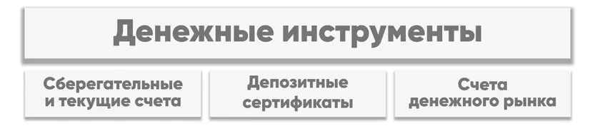 В их состав входят сберегательные и текущие счета, депозитные сертификаты и счета денежного рынка. Это безопасные и ликвидные инструменты инвестиций, но в то же время они приносят скромную прибыль. Они также обеспечивают финансовую гибкость, поскольку игроки рынка могут использовать их в экстренных случаях, на покрытие расходов на проживание и покупку других активов по привлекательной стоимости.