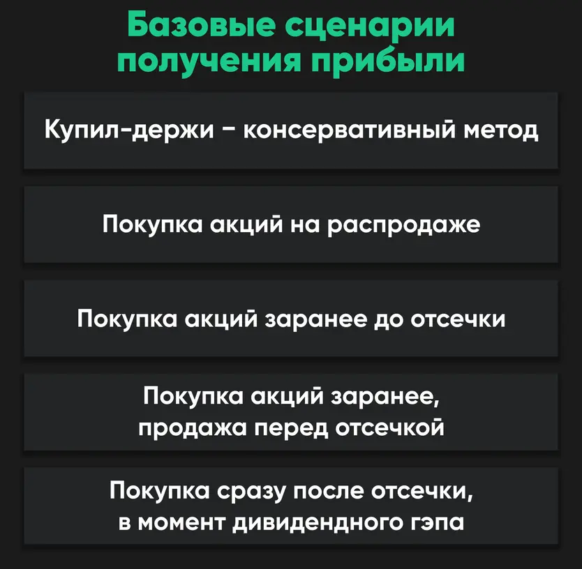 Можно выделить пять базовых сценариев, как получать дивиденды с акций.