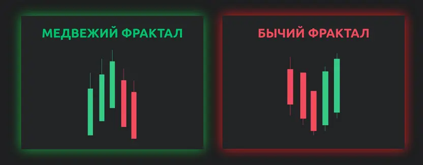 Для того, что бы выявить фрактал, нужно проанализировать пять последовательных свечей, где третья (средняя) является самой высокой (или низкой).