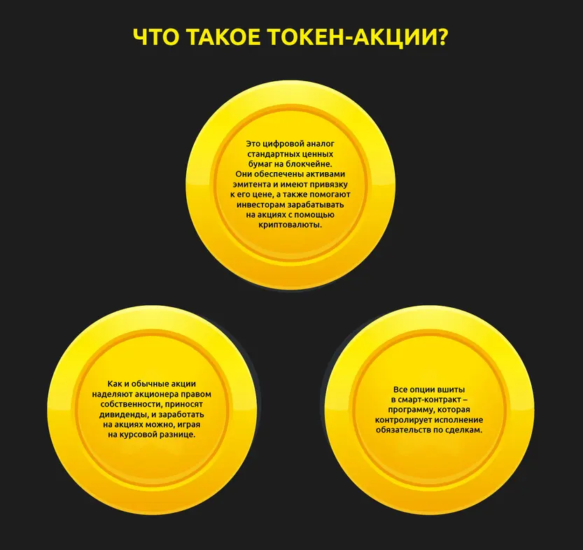 Токен-акции – это цифровой аналог стандартных ценных бумаг на блокчейне. Они обеспечены активами эмитента и имеют привязку к его цене, а также помогают инвесторам зарабатывать на акциях с помощью криптовалюты.