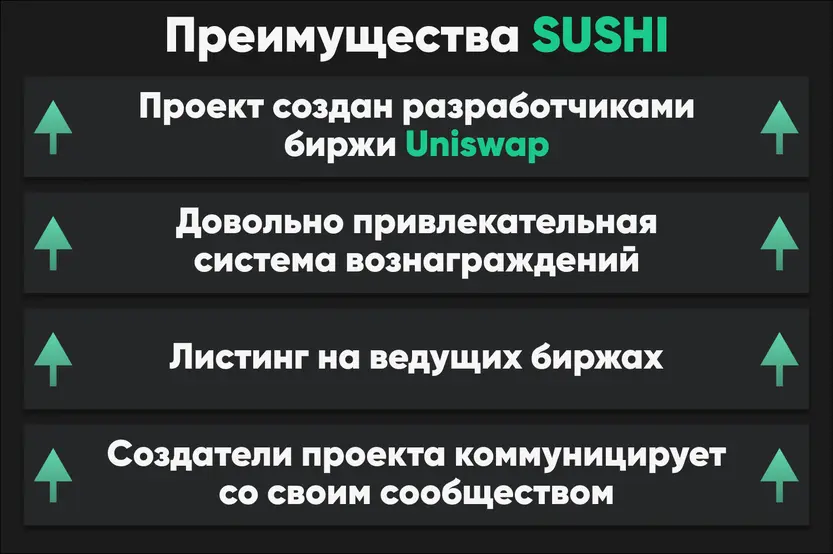 Главный плюс Sushi.com — в том, что проект создан разработчиками биржи Uniswap. Уже сам этот факт говорит о серьезных перспективах новой криптосистемы. Следующий плюс — довольно привлекательная система вознаграждений, от чего во многом зависит цена криптовалюты SushiSwap.