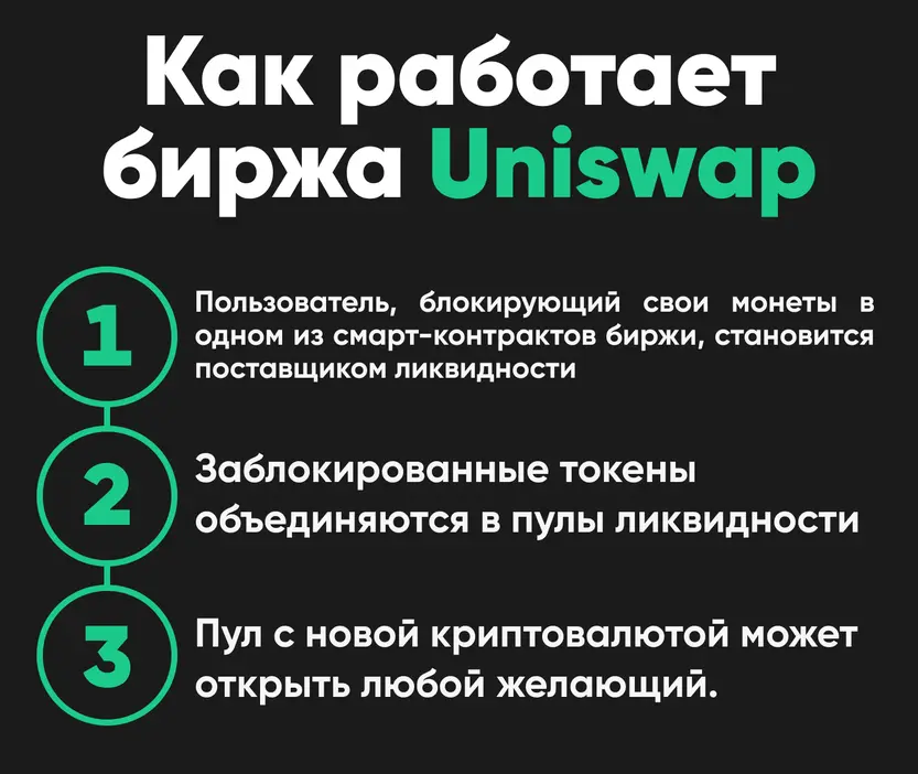Биржа Uniswap работает по принципу пулов ликвидности, которые заменяют книги ордеров. Пользователь, блокирующий свои монеты в одном из смарт-контрактов биржи, становится поставщиком ликвидности. Заблокированные токены объединяются в пулы ликвидности. Пул с новой криптовалютой может открыть любой желающий.