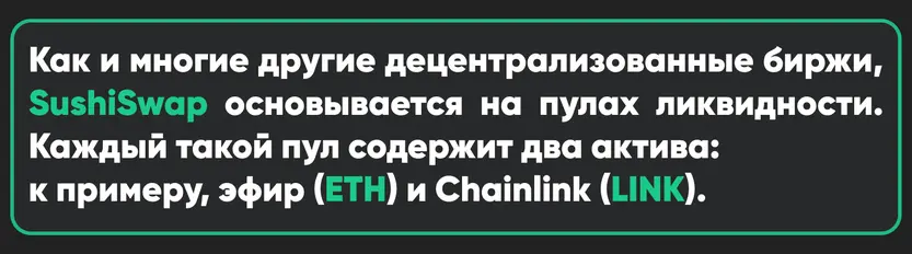 Как и многие другие децентрализованные биржи, криптовалюта SushiSwap основывается на пулах ликвидности. Каждый такой пул содержит два актива: к примеру, эфир (ETH) и Chainlink (LINK). Это стандартное устройство автоматизированного маркетмейкера (AMM), где цены определяются смарт-контрактом на основании соотношения двух активов в пуле.