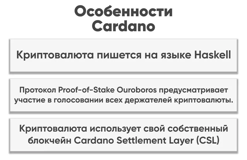 Cardano пишется на языке Haskell, языке программирования с высокой степенью отказоустойчивости. Примененный протокол Proof-of-Stake Ouroboros предусматривает участие в голосовании всех держателей криптовалюты. Он похож на новый протокол Ethereum Casper, но, по заявлению создателей Ouroboros, является единственным алгоритмом консенсуса, безопасность которого можно доказать с помощью математики.