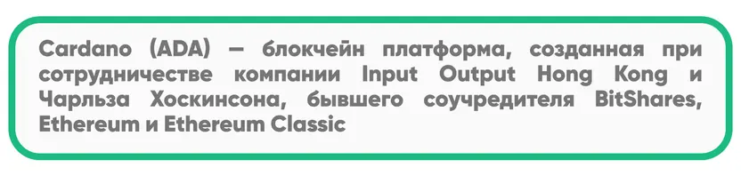 Cardano (ADA) — это блокчейн-платформа, созданная при сотрудничестве компании Input Output Hong Kong (IOHK) и Чарльза Хоскинсона, бывшего соучредителя BitShares, Ethereum и Ethereum Classic. С самого начала позиционируется как альтернатива Ethereum.