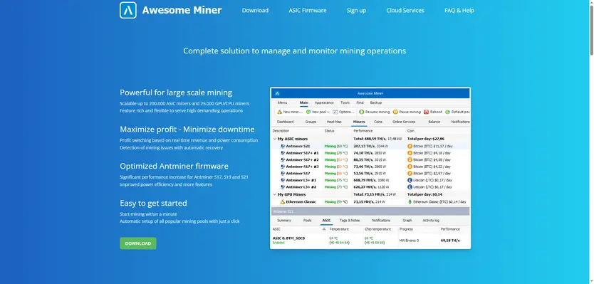 Поддерживаемое оборудование: ASIC-майнеры для алгоритмов SHA-256 и Scrypt (Antminer, Avalon, Whatsminer), старые GPU AMD (через OpenCL)