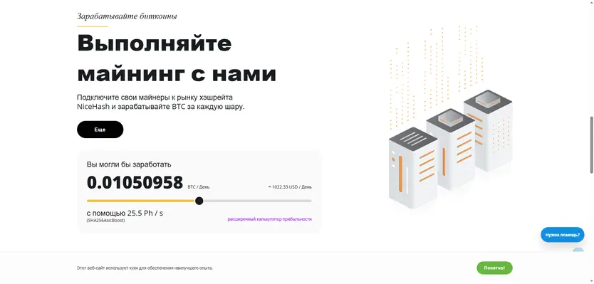 NiceHash занимает особое место на рынке программ для майнинга на компьютере, предлагая уникальную бизнес-модель. Вместо майнинга конкретной криптовалюты вы продаете мощность своего оборудования покупателям хешрейта, получая вознаграждение в биткоинах.