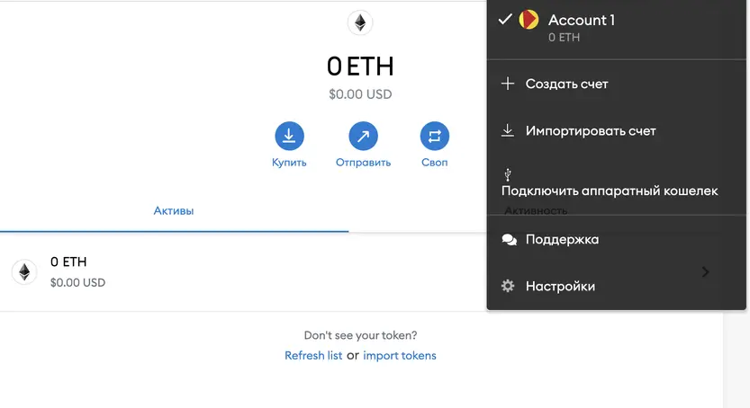 После этого вам станет доступно главное меню MetaMask, через которое можно купить, отправить или обменять криптовалюту.