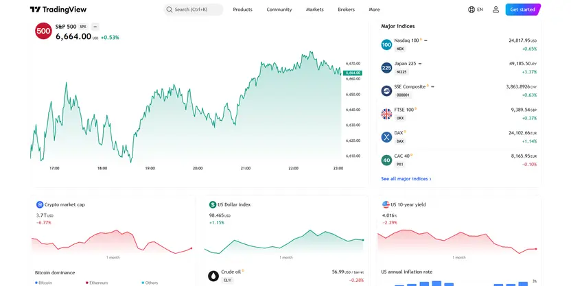 TradingView решает эту проблему. Это профессиональная платформа для технического анализа, которой пользуются миллионы трейдеров по всему миру — от новичков до управляющих хедж-фондами. Здесь вы найдете все необходимые инструменты для принятия взвешенных торговых решений: продвинутые графики, сотни индикаторов, возможность создавать собственные скрипты и даже торговать напрямую через платформу.